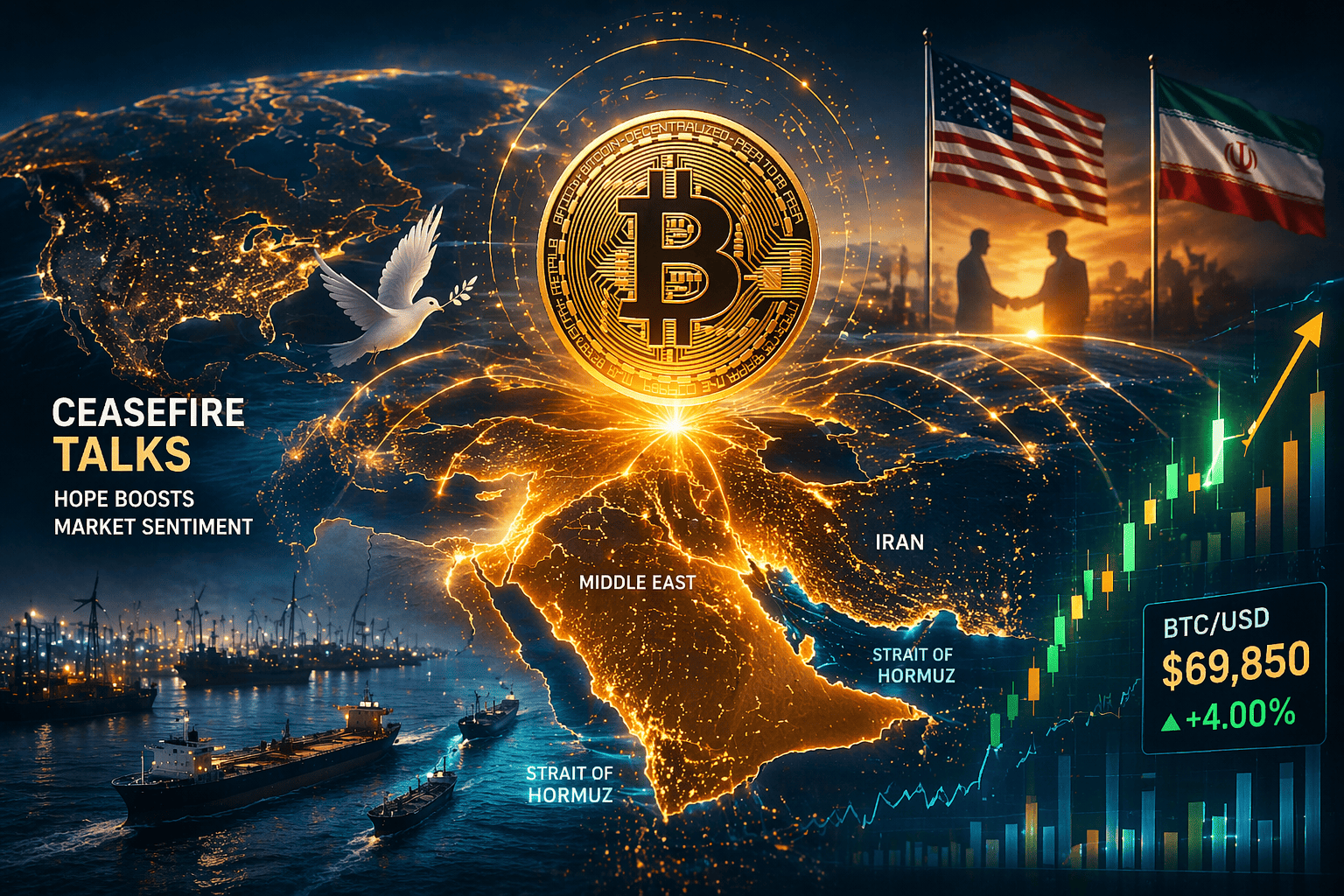 Bitcoin zette maandag zijn opwaartse trend voort en steeg met 4%, waarmee de koers dicht bij de $70,000 kwam. Deze stijging volgt op groeiend optimisme in de markten rond een mogelijk staakt-het-vuren in het Midden-Oosten.